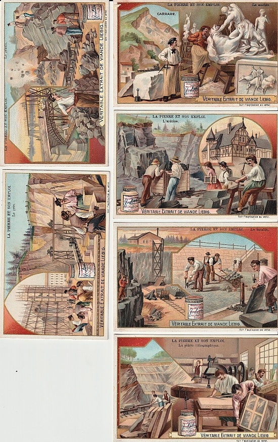 Z "nášho bridlicového pohľadu" je zaujímavá sada 6 ilustrovaných obchodných kariet z edície "LA PIERRE ET SON EMPLOI." - v preklade: Kameň a jeho využitie.