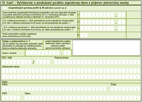 IV. časť - Vyhlásenie o poukázaní podielu zaplatenej dane z príjmov právnickej osoby.