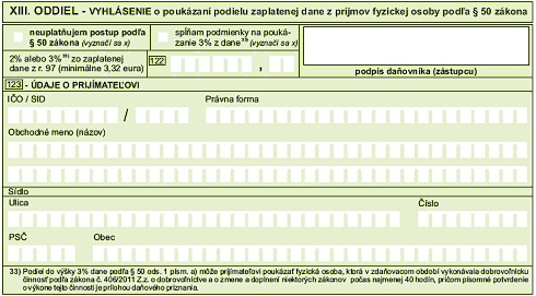 Ak podávate daňové priznanie pre fyzické osoby - typ B, potom venujte pozornosť XIII. Oddielu - Vyhlásenie o poukázaní