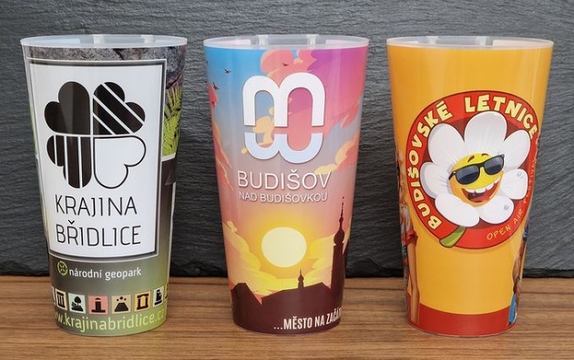 Plastové vratné kelímky, ktoré budú využívané na akciách mesta Budišov nad Budišovkou, Krajiny břidlice a na Budišovských Letniciach. Zverejnené 3.4.2024.