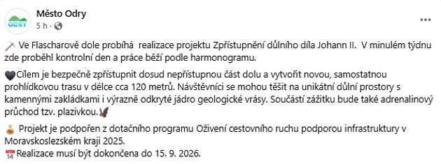 Mesto Odry plánuje sprístupniť do roku 2020 tri bridlicové štoly. Bližšie informácie -