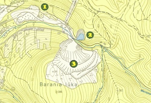 1- bývalá šifrová jama, 2- I. mariansky kameňolom, 3- II. mariansky kameňolom