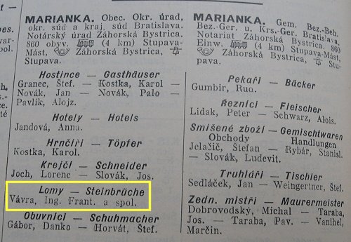 „V roku 1930 marianske kameňolomy dostaly (reprodukujeme text verne, podľa vtedy platného pravopisu) nového majiteľa. Bol ním ing. Vávra, ktorý lámanie kameňa hodne zdokonalil. Už nemuseli robotníci roztĺkať kamenie ručne, ale do lomu priviezli mocný chrupač (takto nazývali a dodnes nazývajú v marianskom nárečí drvič) na benzínový pohon. Po smrti otcovej prevzal lom syn, ktorý nahradil benzín a naftu elektrinou. Takto sa dolovanie hodne zdokonalilo a otvorili sa ďalšie a ďalšie lomy“.